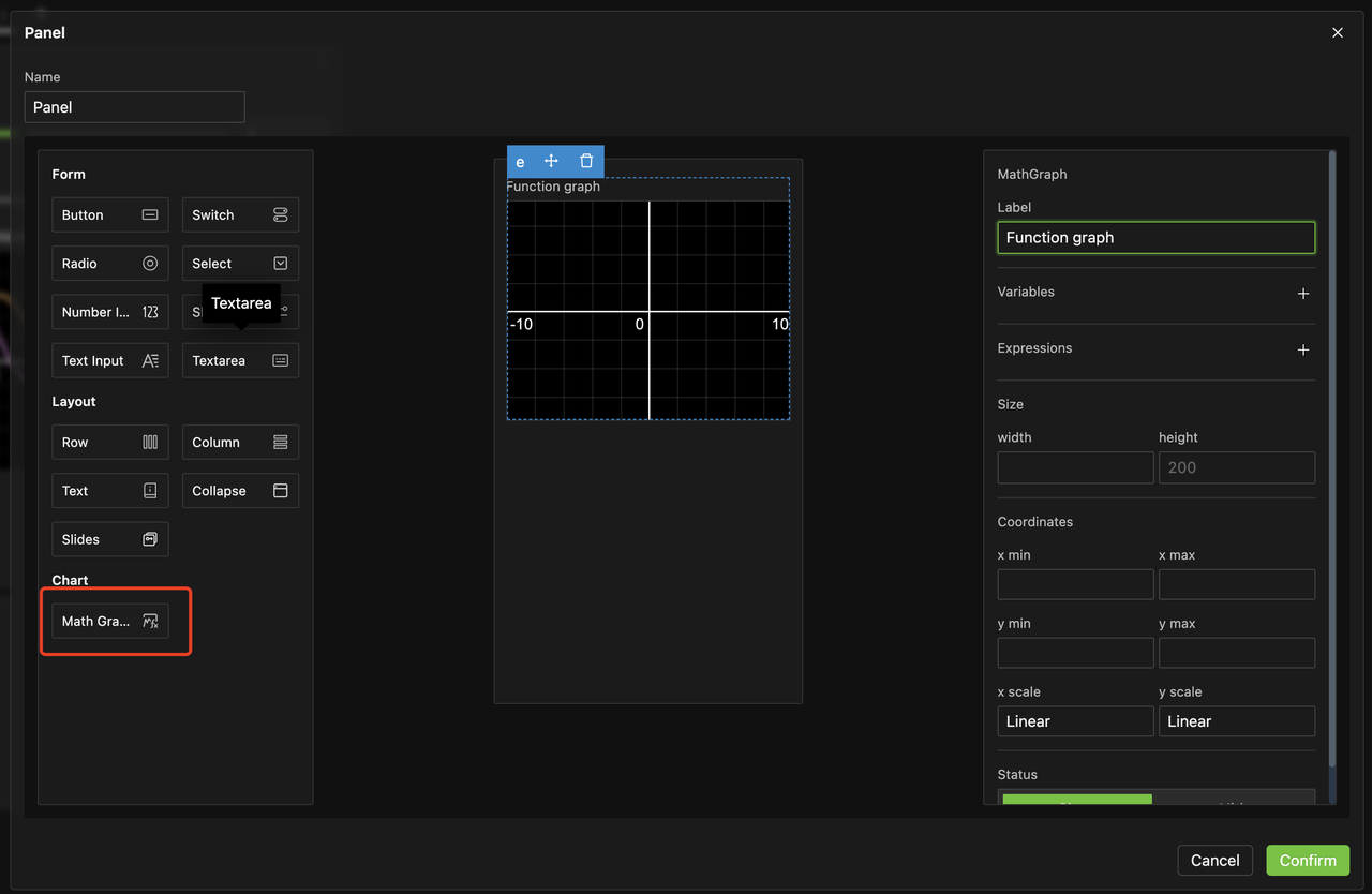 进入面板卡片的编辑模式,从左边的组件栏拖出一个函数图像组件,放在中间的面板画布中,点击选中它,在右侧的属性设置栏配置,如下图。