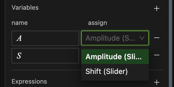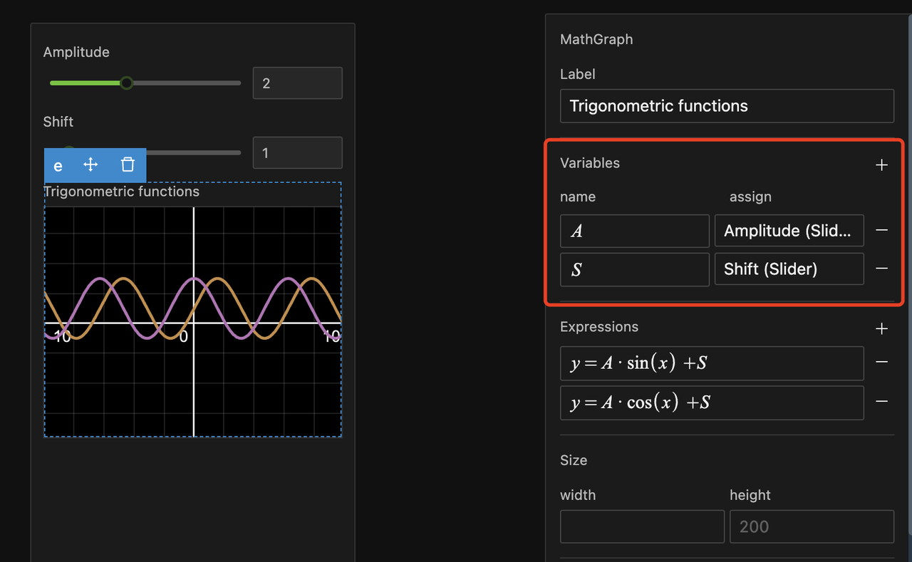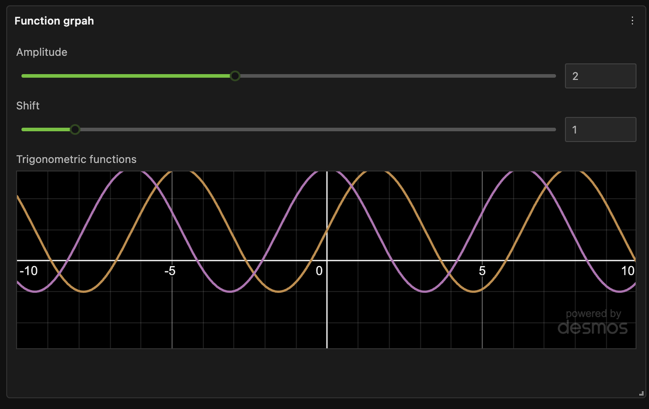 在Graph1仪表盘中,调节滑块Ampitude和Shift时,以下两个函数图像将实时响应变化: