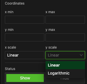 - 横轴、纵轴刻度默认线性,可以选择对数刻度。