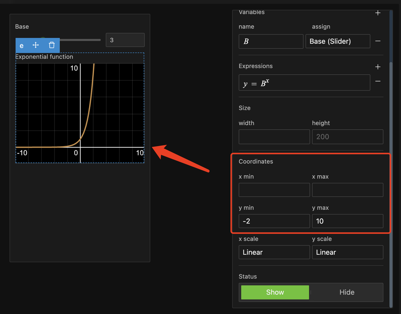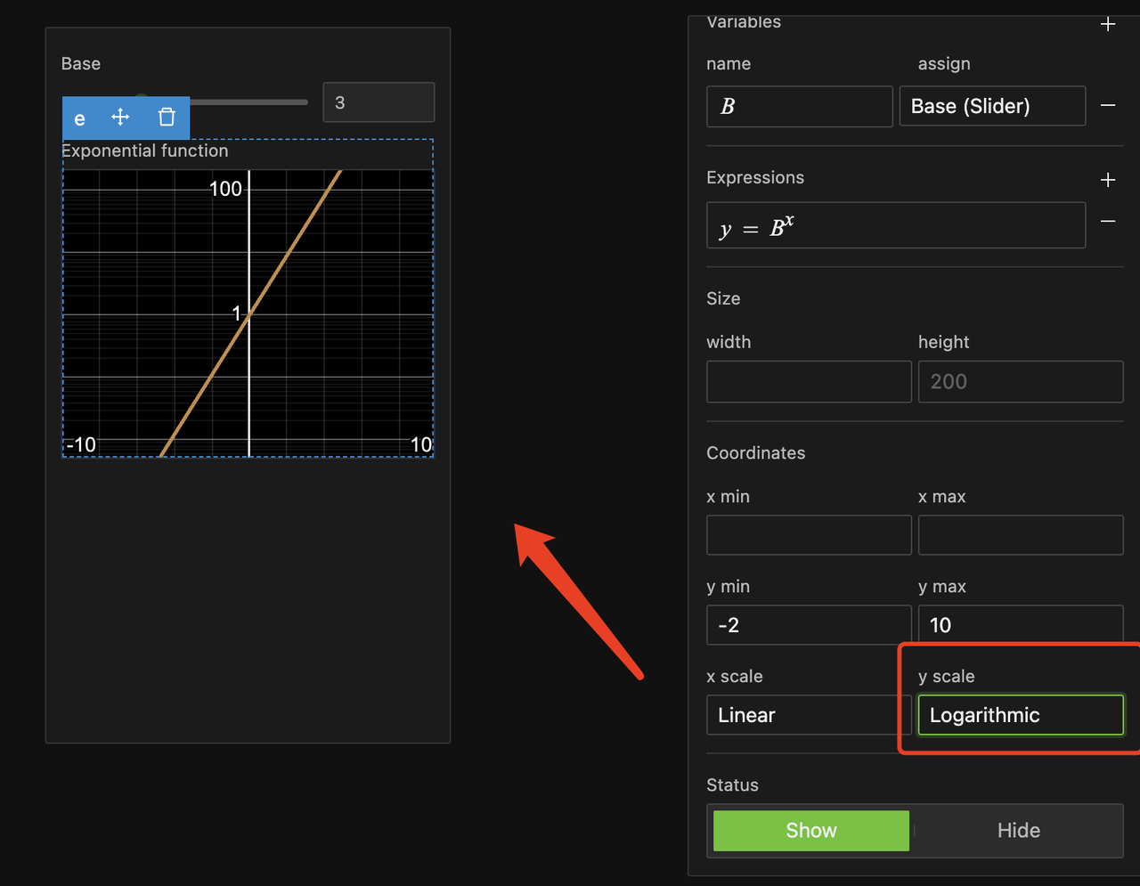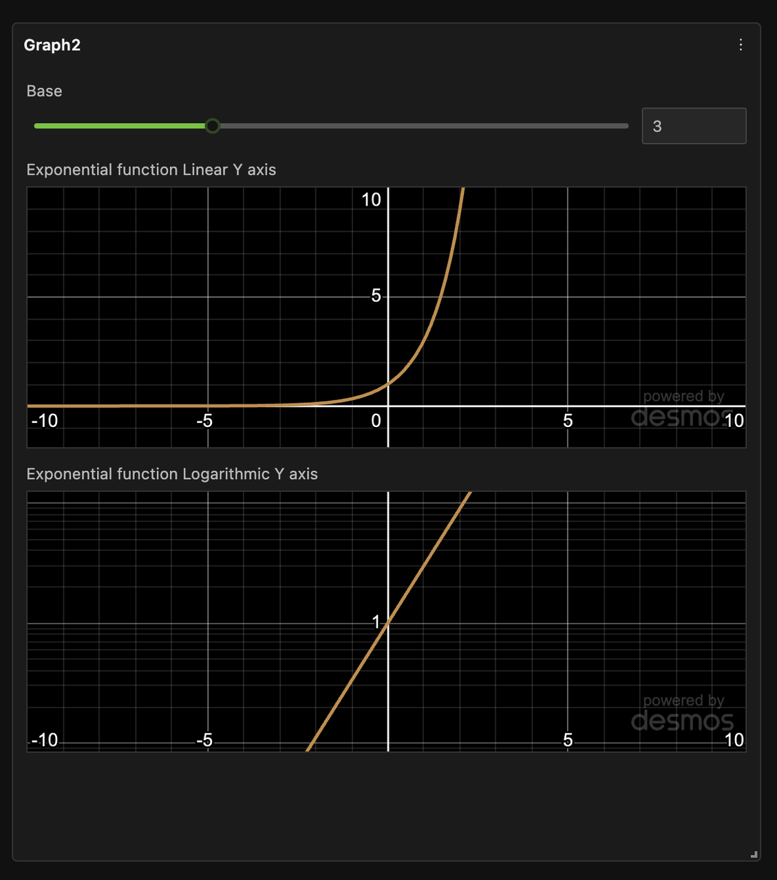 在Graph2仪表盘中,调节滑块Base时,指数函数 y = Base^x 以Y轴为线性和对数刻度的两个图像都会实时响应变化。