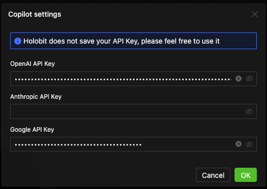 请放心输入您的秘钥,它只存在于您的客户端,HoloMind不会保存它。