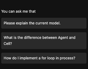 - AI助手掌握平台使用方法,系统仿真的语法逻辑,能“看 到”当前工作情景所处画布的位置,以及你选中的模型对象等,所以你随时都可以问“请解释模型当前画布”,“请解释我选中的流程”,“请求组件如何设置”等问题。