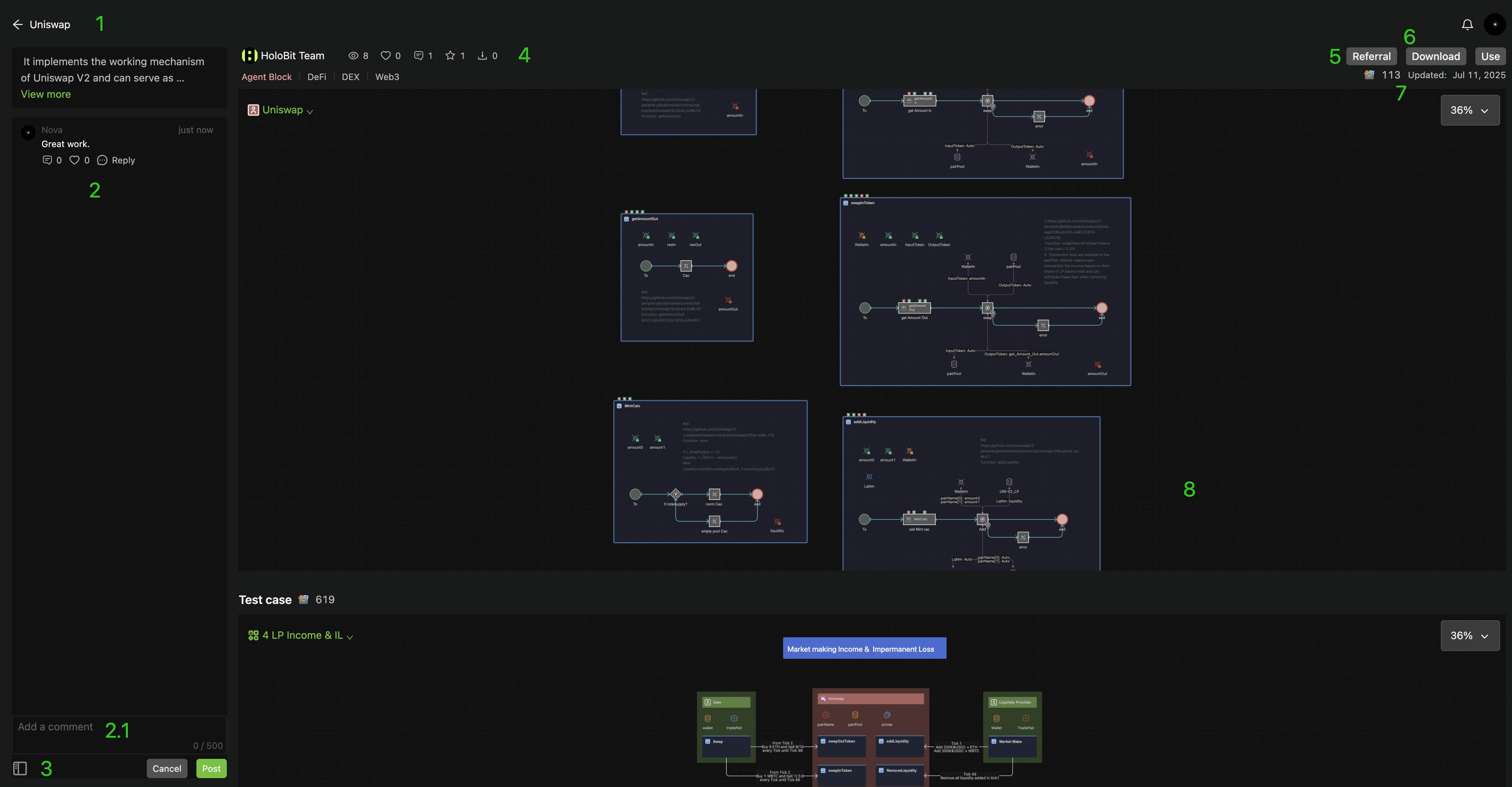 - 对于引用模式,作者可以选择是否主张版税,即在使用者交易相关作品时需向其缴纳的费用,以及设定是否开源,即是否支持使用者查看作品内部细节。