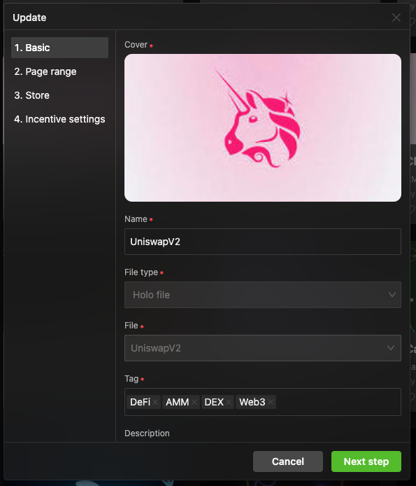 点击市场主页右上角“发布”按钮,在弹出的发布设置对话框中进行配置,是发布Holo文件的第3种形式。