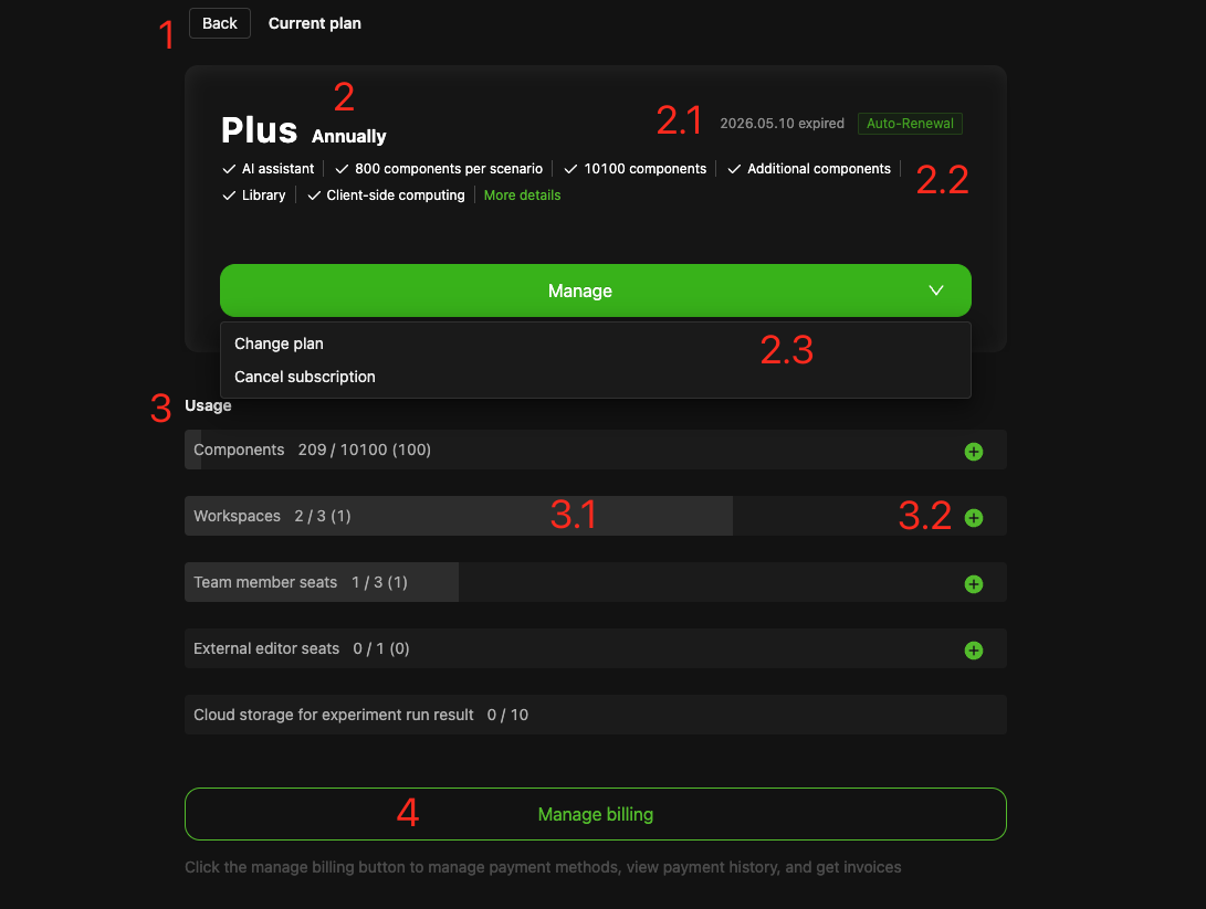 2.2 当前订阅计划功能技术特征信息。 2.3 管理订阅计划按钮,包括调整订阅计划和取消/续订订阅计划。