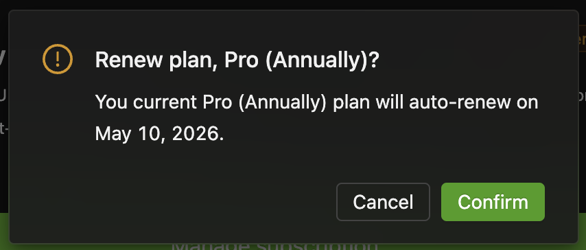 提示您的年度和月度付费计划将自动续订,直到您取消。