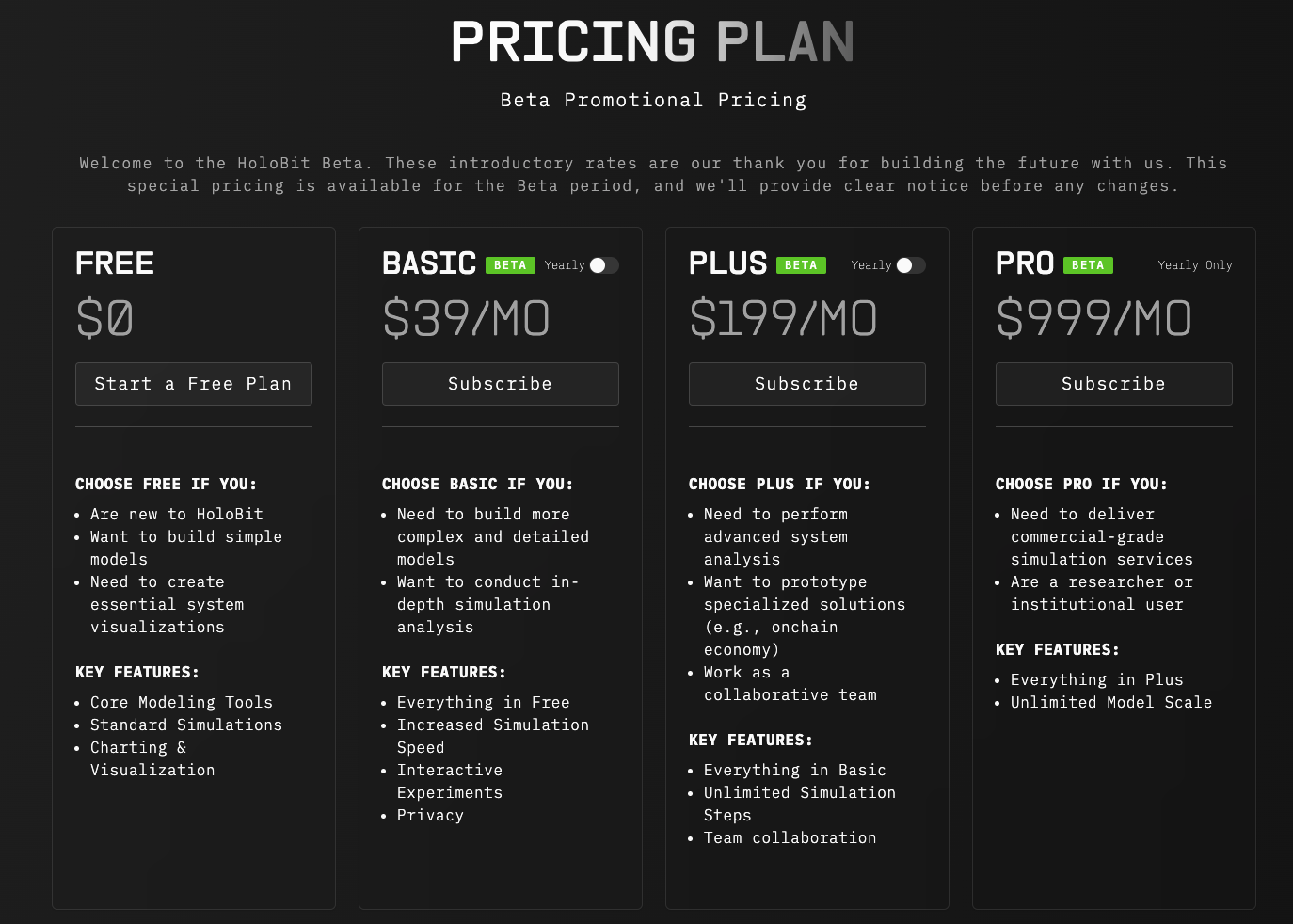 所有级别基准订阅计划的具体功能、资源额度情况及规则详情请查看HoloMind官网定价页面相关信息。