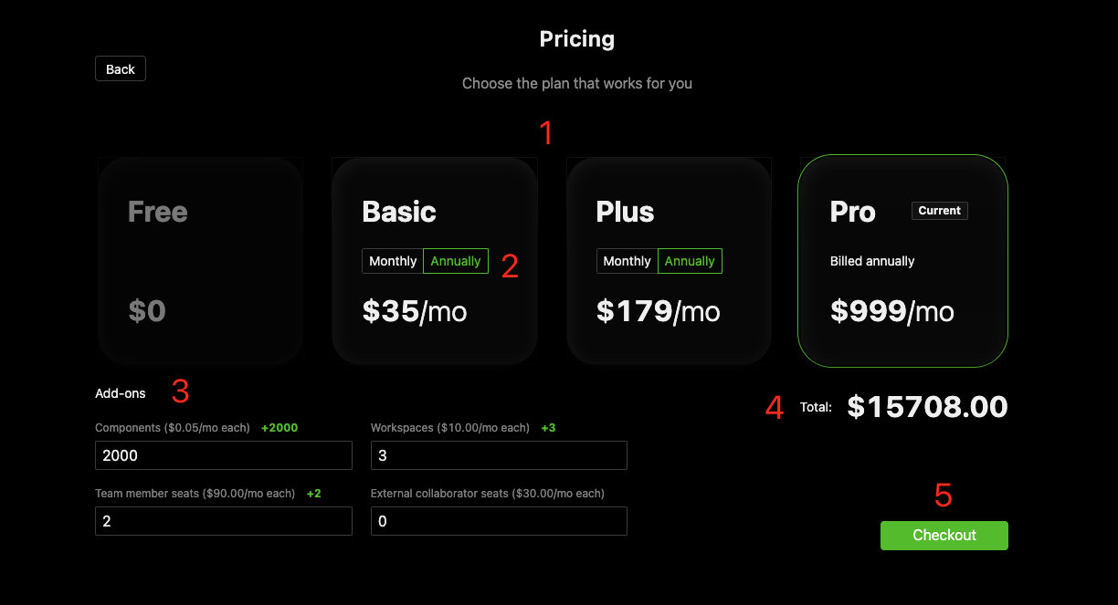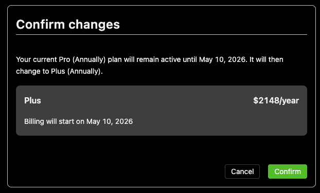 - 在官网的定价页面选择目标计划后点击订阅按钮将直接进入更改订阅页面。