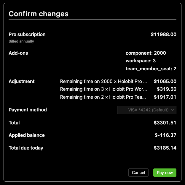 如果需要支付费用(通常是升级计划),如上图,点击现在支付按钮后将触发付款,成功支付后改变将生效。