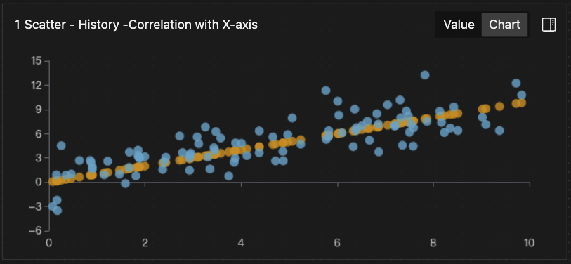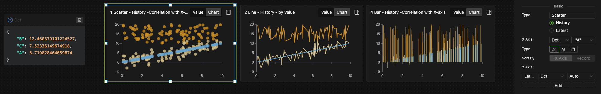 可以展示数据对象相对于系统时间的趋势(横轴为Tick或Now),或相对于其它数据对象历史趋势的相关性(横轴纵轴均为指定数据对象,如下右图)