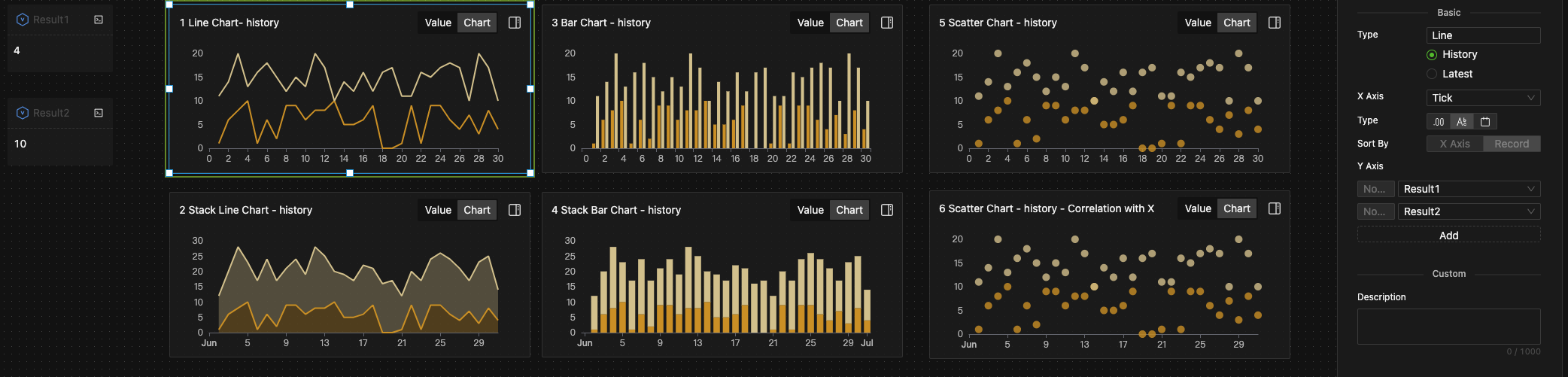 每个Tick我们分别对变量Result1和Result2进行均匀分布随机采样,Result1 = random(0,10),Result2 = random(10,20),于是我们可以得到2个不相关的时间序列(因为两者独立采样),分别以不同图表展现。