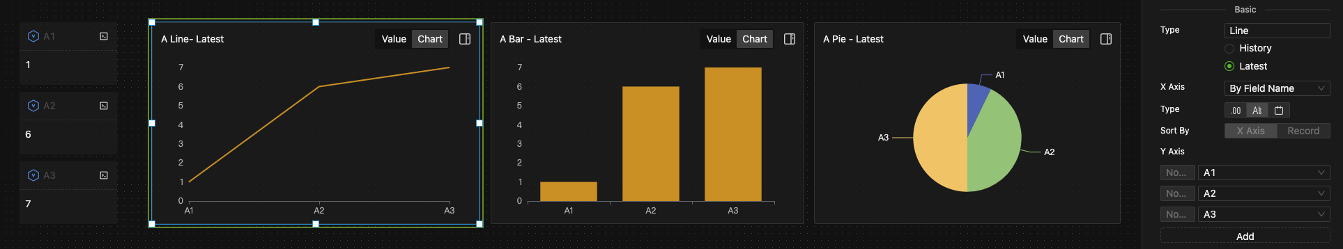 - 情况1:横轴选择按字段名,此时系统将Y轴所选对象名称作为维度值,Y轴对象取值作为度量值绘图