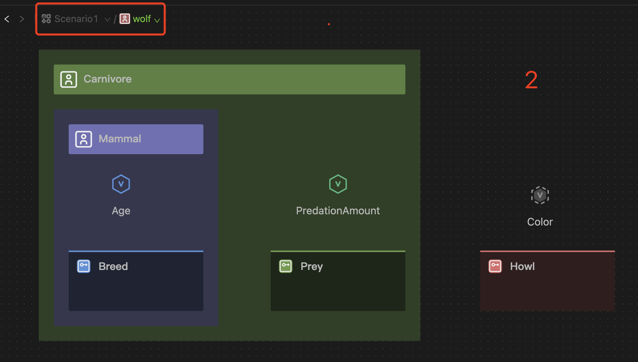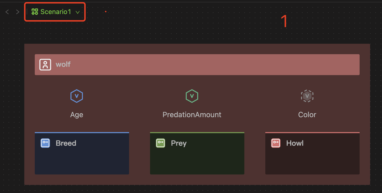 在实体对象内画布拖入放置块(定义)代表继承,例如新建一个狼Agent,从库中拖拽放置“哺乳动物”块到其内部画布,如下图